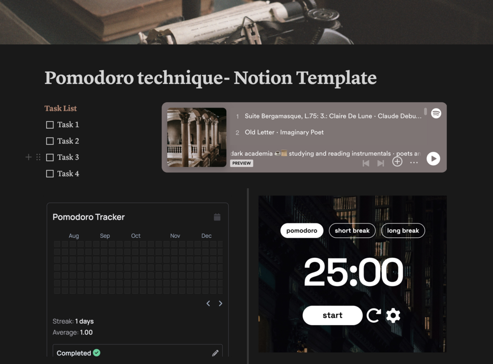 Track your study habits and organize your techniques with a dark academia-themed Pomodoro timer.